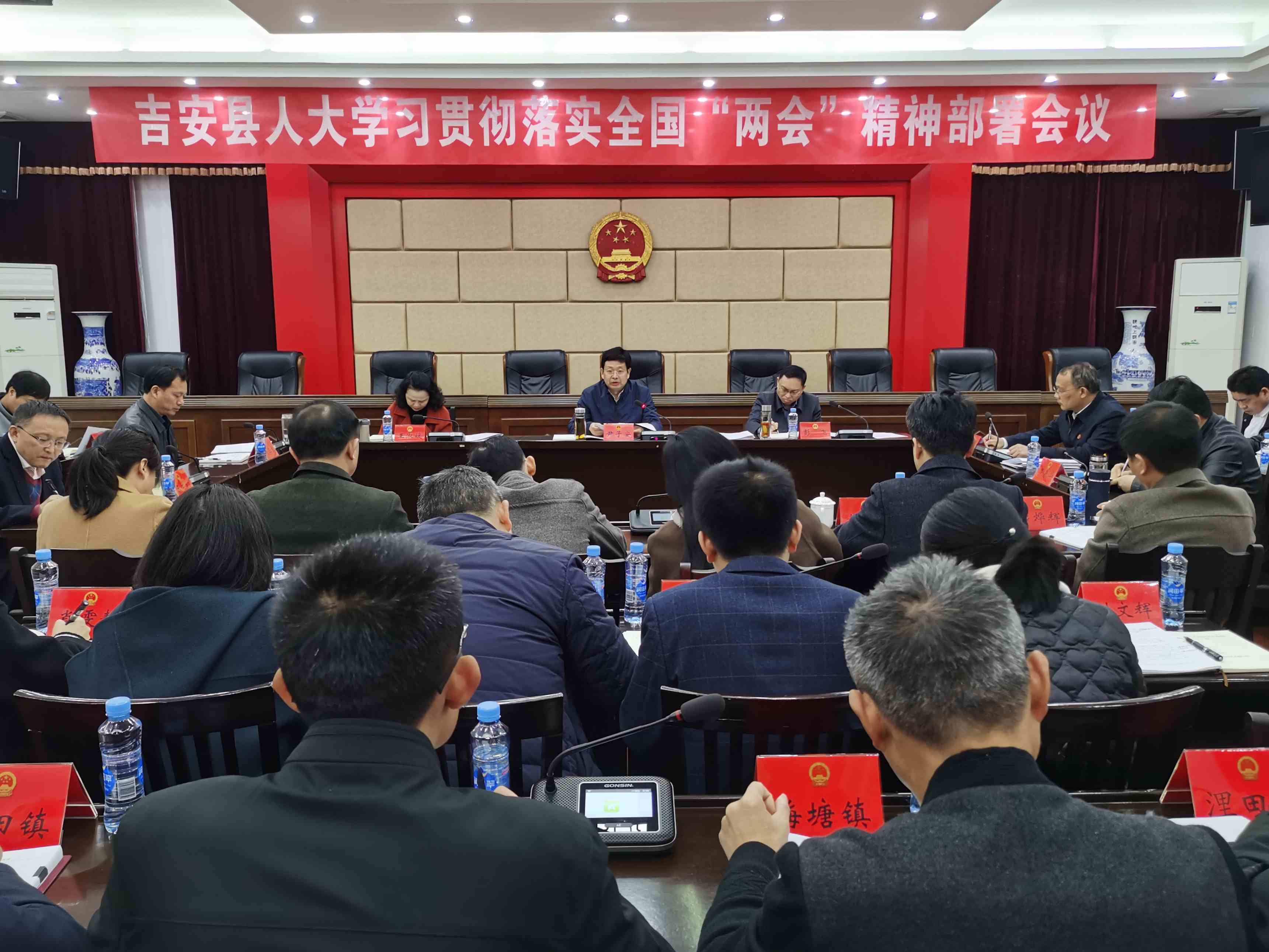 3月20日上午,吉安县人大常委会召开学习贯彻落实全国“两会”精神部署会。县人大常委会副主任彭飞主持会议,县人大常委会副主任罗勤华传达习近平总书记在全国两会期间的重要讲话精神和十四届全国人大一次会议精神,县人大常委会主任尹子安作强调讲话。县人大常委会班子成员、人大机关全体干部职工、各乡镇人大主席参加会议。