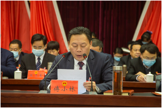 县委书记傅小林在闭幕大会上讲话。他指出,会议期间,全体代表肩负全县人民重托,充分发扬民主,积极建言献策,认真履职尽责,审议通过了政府、人大、法院、检察院等7个工作报告,反映了全县人民的共同意愿。大会开得很成功,是一次高举旗帜、团结鼓劲,风清气正、催人奋进的大会。